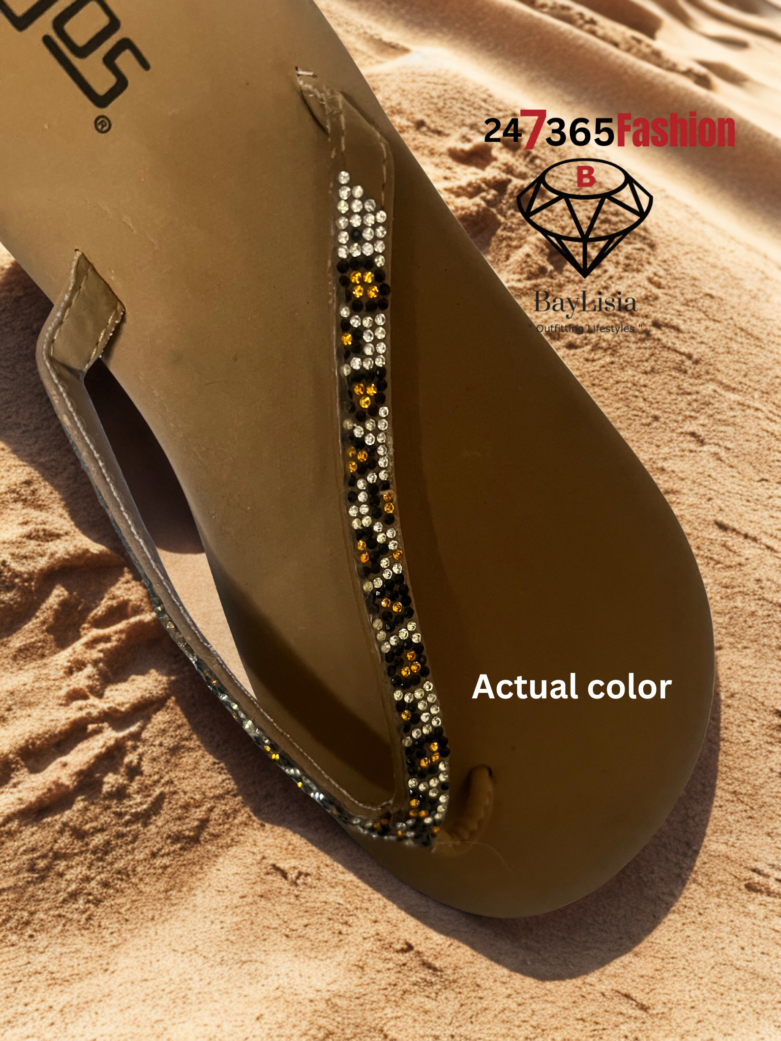 Flojos Crystal-Trim Flip-Flop Sandals (Tan/Gold Sparkle) Size 8